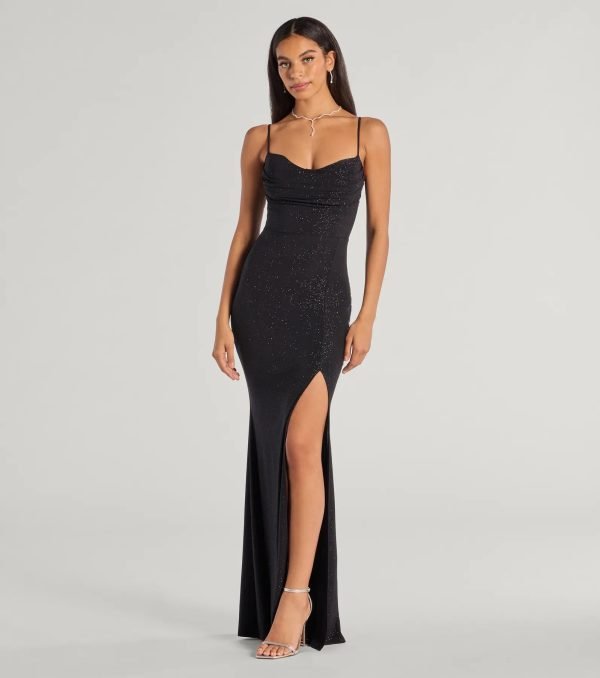 Radiate glamour in a long glitter dress that features a sleeveless sweetheart neckline with a draped cowl neck overlay, spaghetti straps, and a captivating mermaid silhouette that is accented with a high side slit. Complete your formal outfit with a rhinestone clutch.