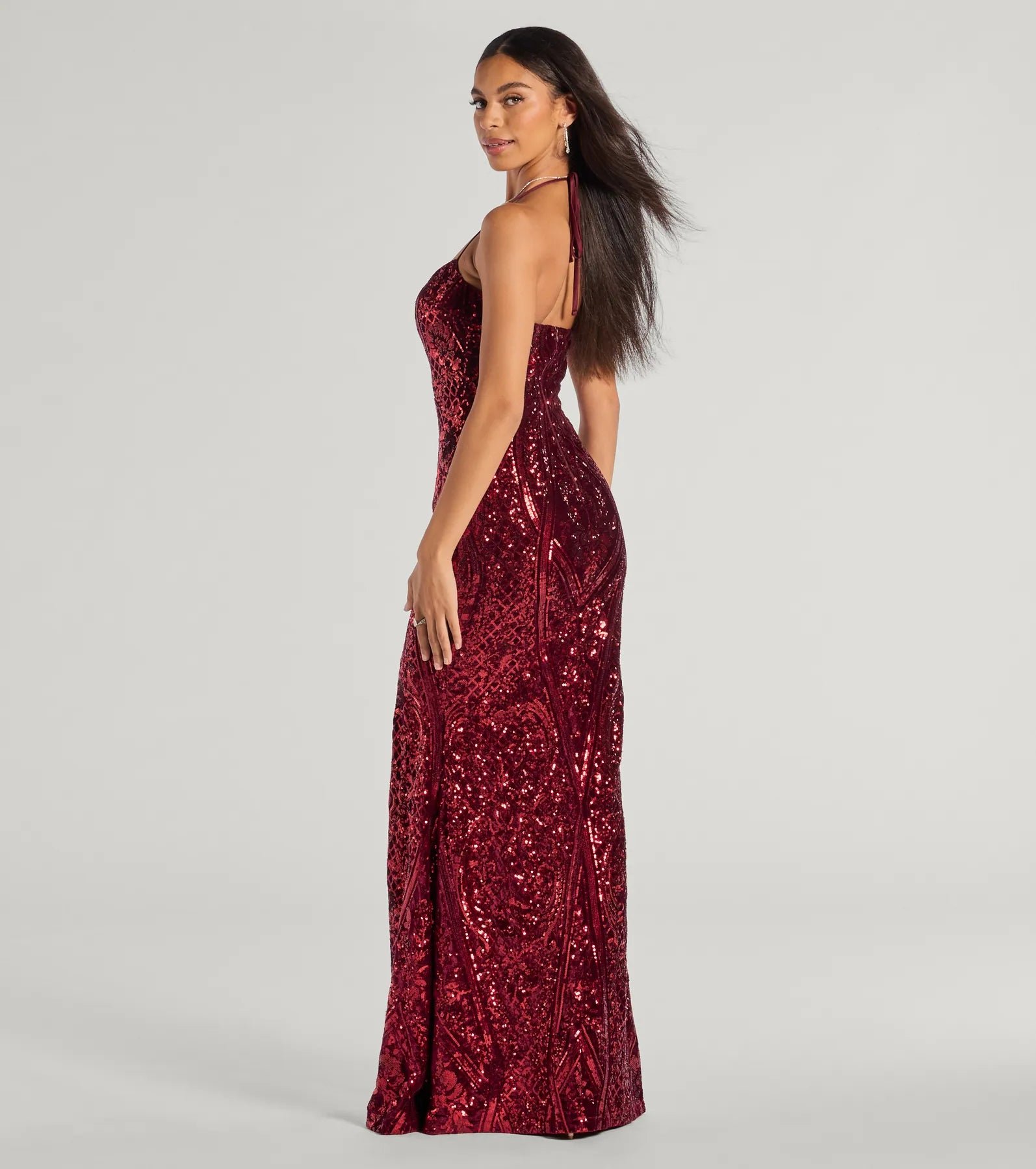 Radiate a glamorous aura in the Meara formal column dress crafted with luxe velvet fabric and all-over sequin embroidery in a chic abstract pattern. It features a sleeveless sweetheart neckline, tie-back halter straps leading to a partially open back, and a high-cut front slit to accent the floor-length column silhouette.