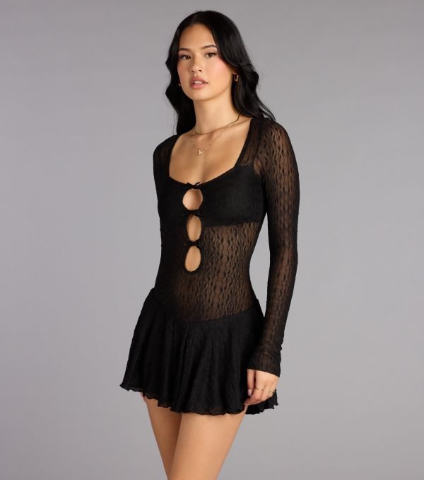 All eyes on you. This sheer lace mini dress stuns with daring cutouts and a flirty A-line hem, making it the perfect dress for dancing, cocktails, and everything in between.