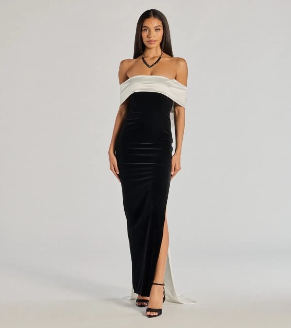 Have an iconic moment at your black-tie soiree in the gorgeously chic Verona velvet formal dress designed with a satin off-the-shoulder fold-over neckline and a large bow back accent with a cascading floor-length train. The dress features a high-cut side slit to showcase some leg on the long slim-fit silhouette.